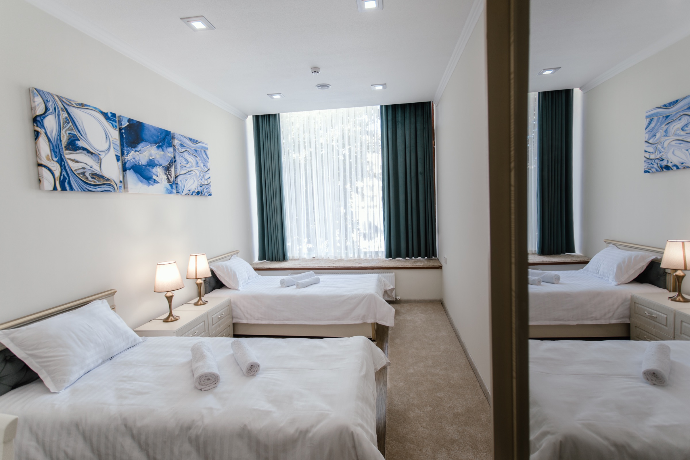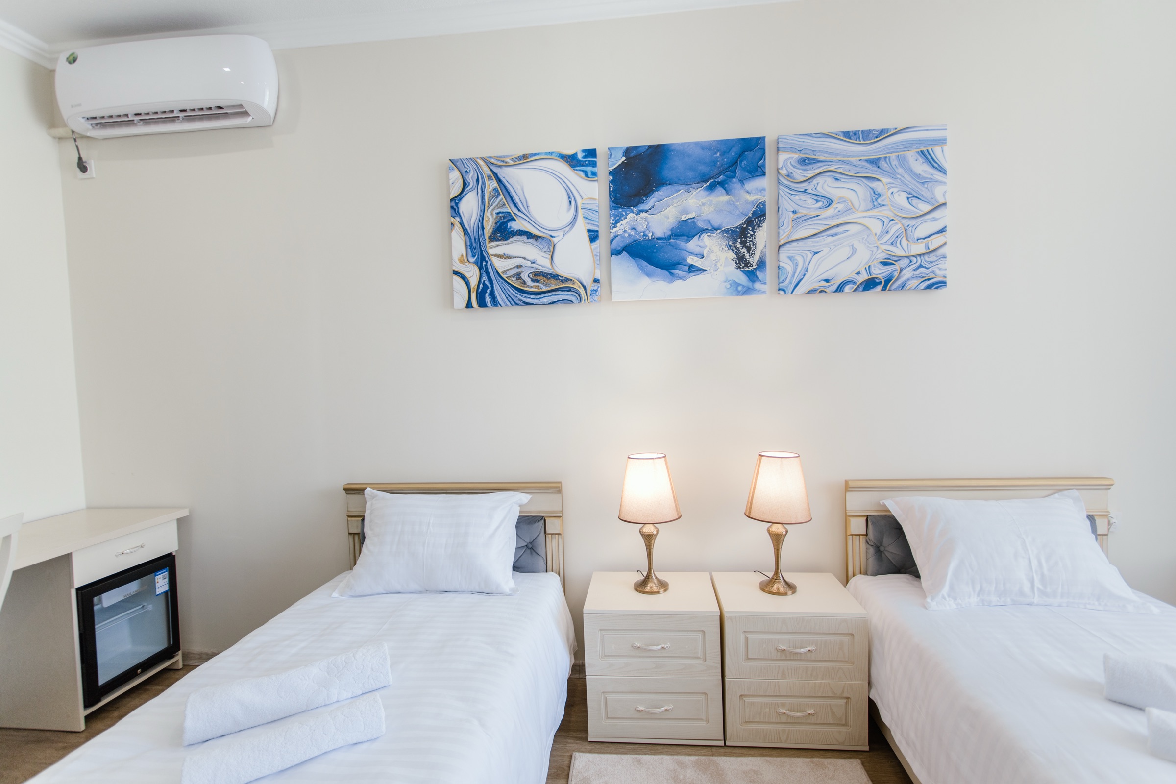 Просторный светлый номер с двумя односпальными кроватями, рабочей зоной, кондиционером и современной ванной комнатой. Отличный выбор для друзей и деловых поездок вдвоём.